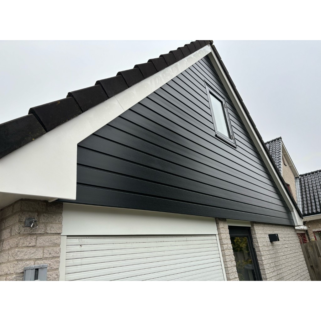 Keralit Sponningdeel 143 Zwart kunststof gevelbekleding is van hoge kwaliteit met een gegarandeerde en bewezen betrouwbaarheid. Keralit Sponningdeel heeft een natuurlijke, chique en moderne uitstraling met een garantie van 10 jaar. Vanwege de mooie strakke groef die in de plank verwerkt is, krijg je een heel mooi eind effect in je gevelbekleding. Door de lage paneelhoogte krijg je een mooie afgewerkte uitstraling.