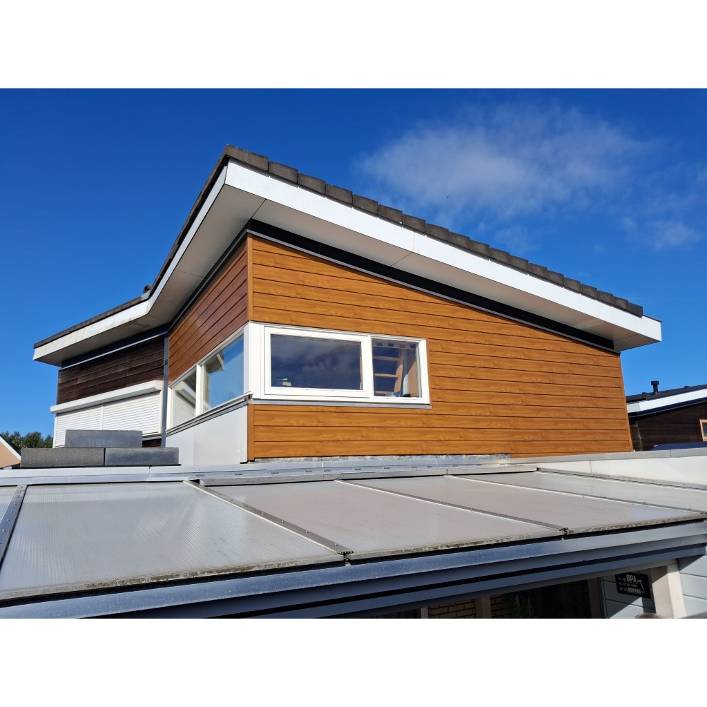 VinyPlus Sponningdeel Goud eiken kunststof gevelbekleding ook wel rondkant genoemd is van hoogwaardige kwaliteit met een gegarandeerde en bewezen betrouwbaarheid. Daarom ben je verzekerd van een prachtige, elegante en moderne uitstraling met jarenlange garantie. Vanwege de ruim afgeronde sponning wordt er een rustig, ruim en robuust aanzicht gecreëerd. Dit is in vergelijking met andere merken een veel genoemd pluspunt.