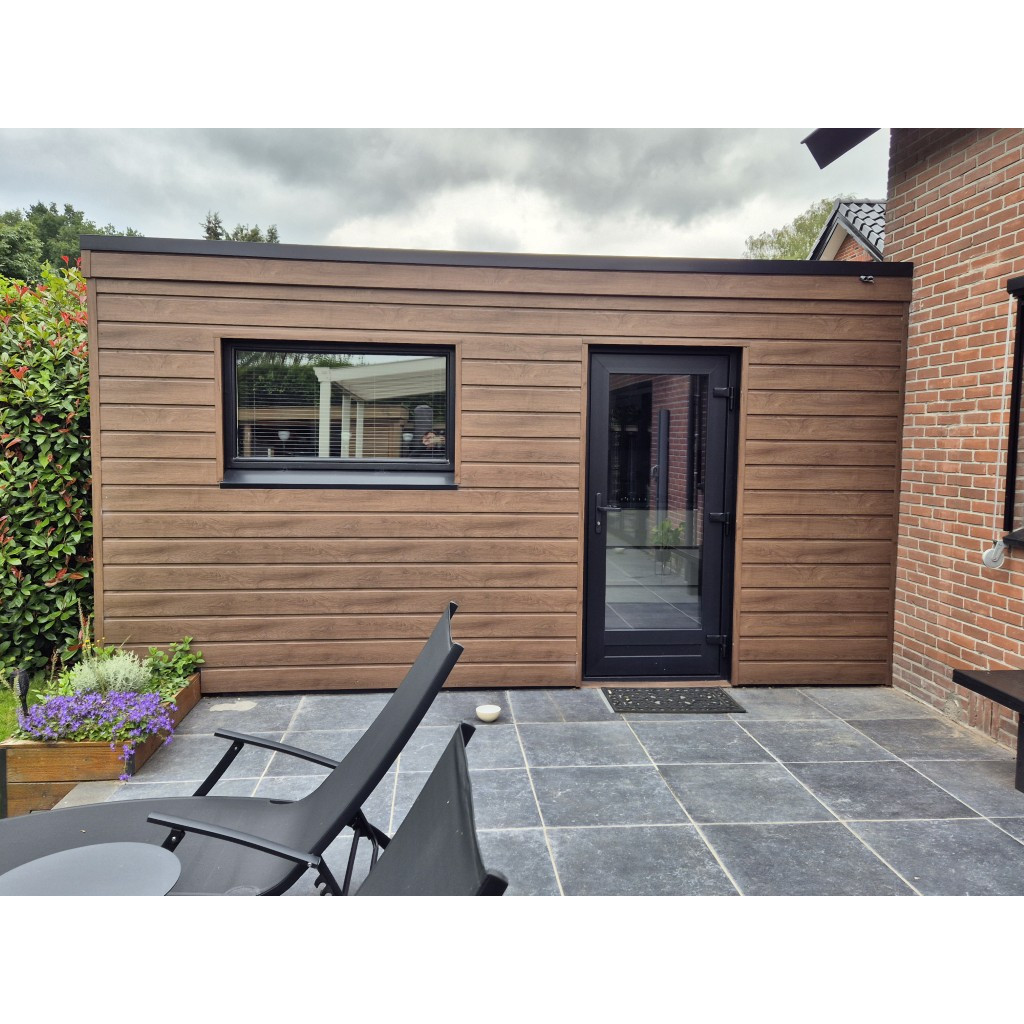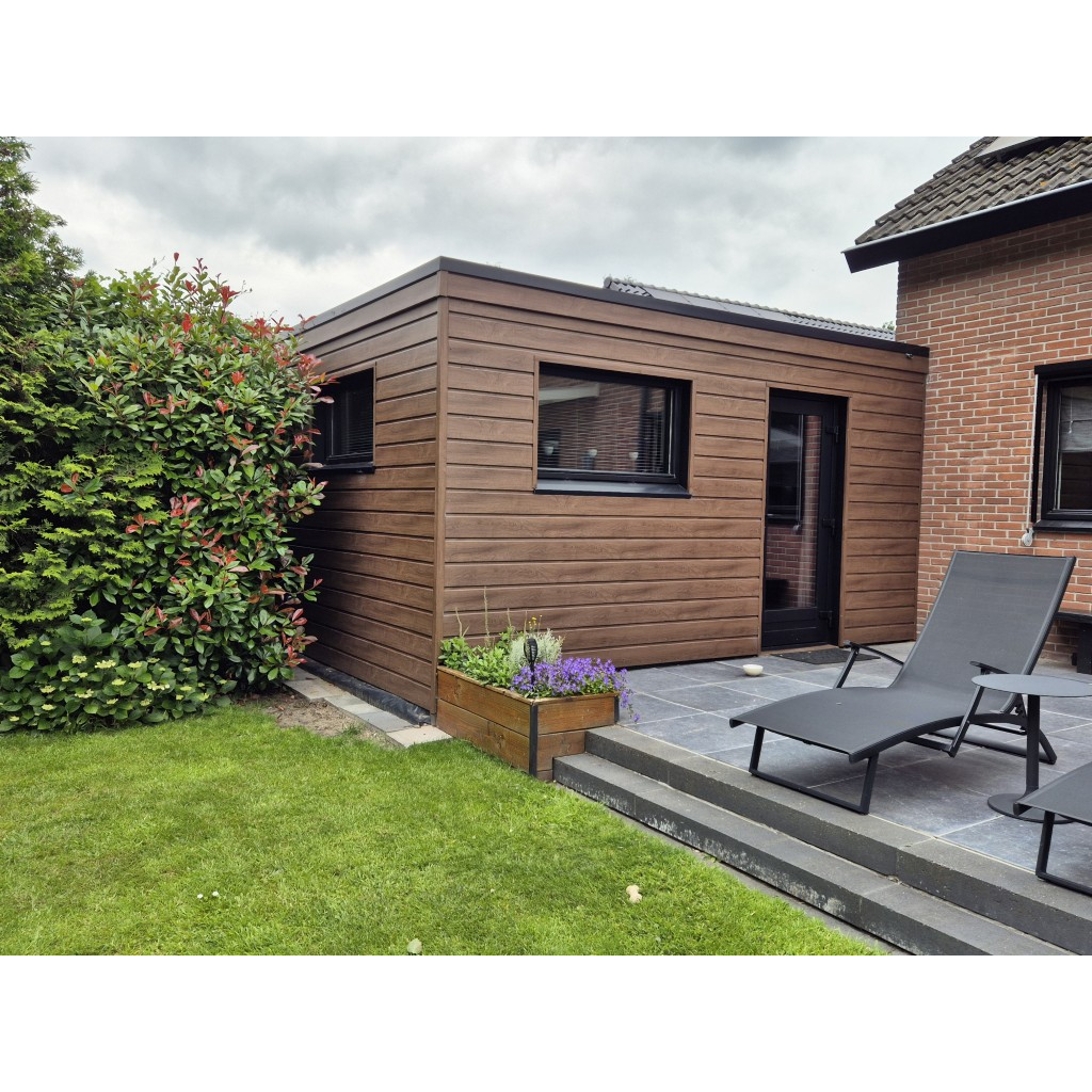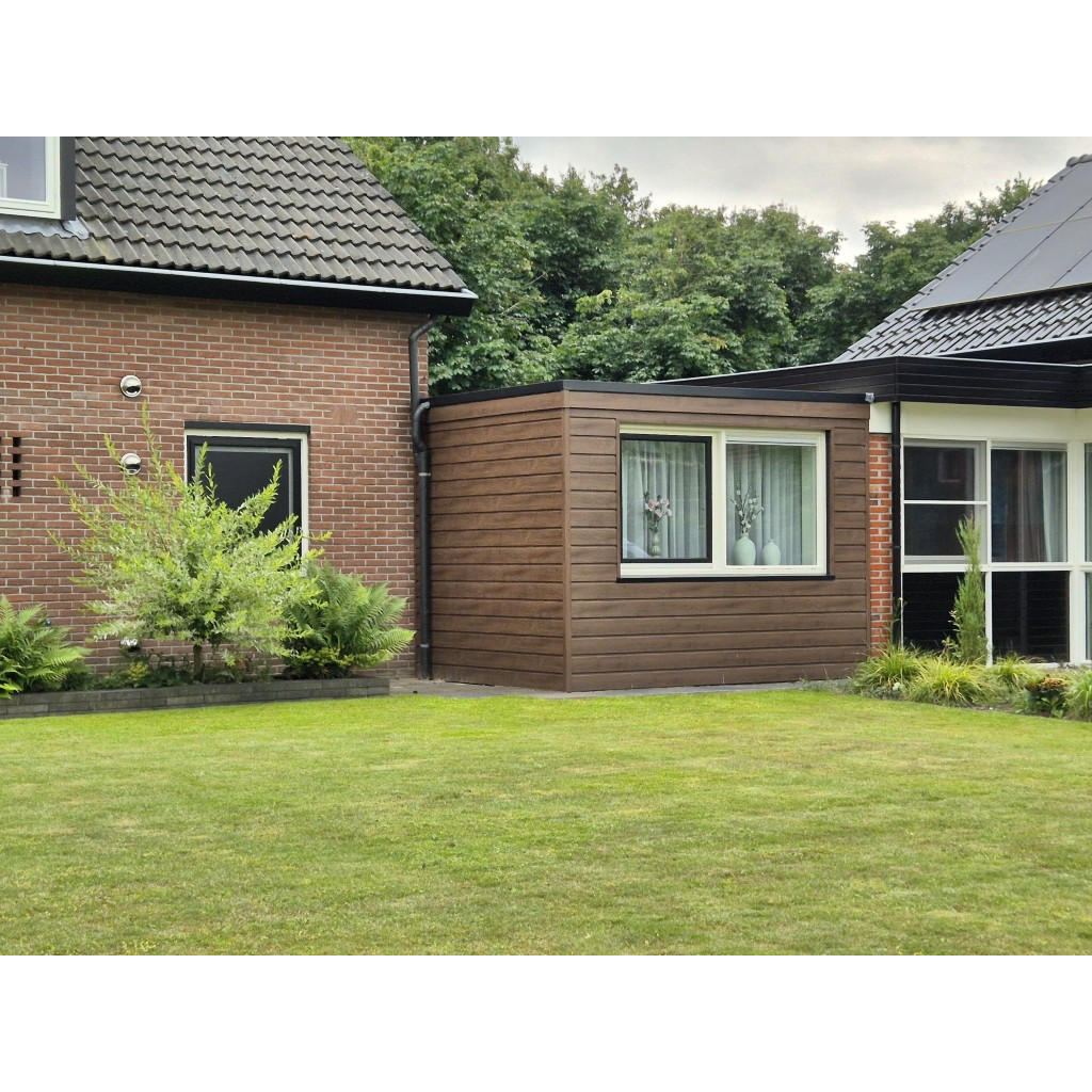 VinyPlus Sponningdeel Turners Eiken Bruin kunststof gevelbekleding ook wel rondkant genoemd is van hoogwaardige kwaliteit met een gegarandeerde en bewezen betrouwbaarheid. Daarom ben je verzekerd van een prachtige, elegante houtlook en moderne uitstraling met jarenlange garantie en een meer natuurgetrouwe kleur echtheid dan hout. Daarnaast is hout per vierkante meter (M2) waarbij deze uitstraling niet haalbaar is ook nog eens een stuk duurder en minder eenvoudig te monteren i.v.m. de vorm en rechtheid. Vanwege de ruim afgeronde sponning wordt er een rustig, ruim en subtiel aanzicht gecreëerd. Dit is in vergelijking met andere merken en materialen een veel genoemd pluspunt. Eenvoudig horizontaal en verticaal te monteren.